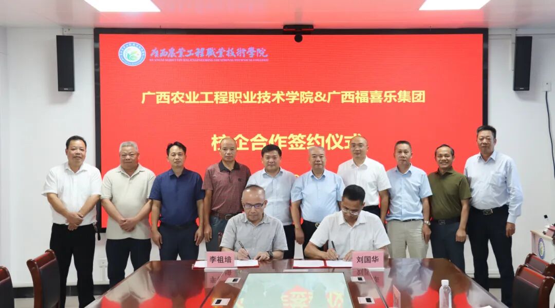 随后,在校企双方共同见证下,李祖培副校长与广西福喜乐集团总裁刘国华分别代表校企双方签署合作协议。