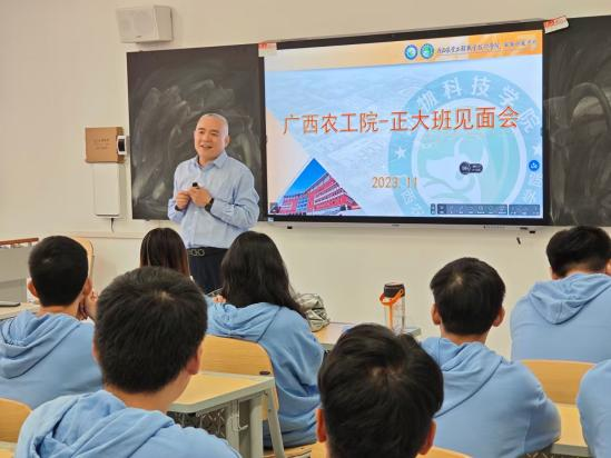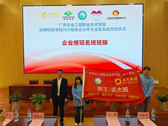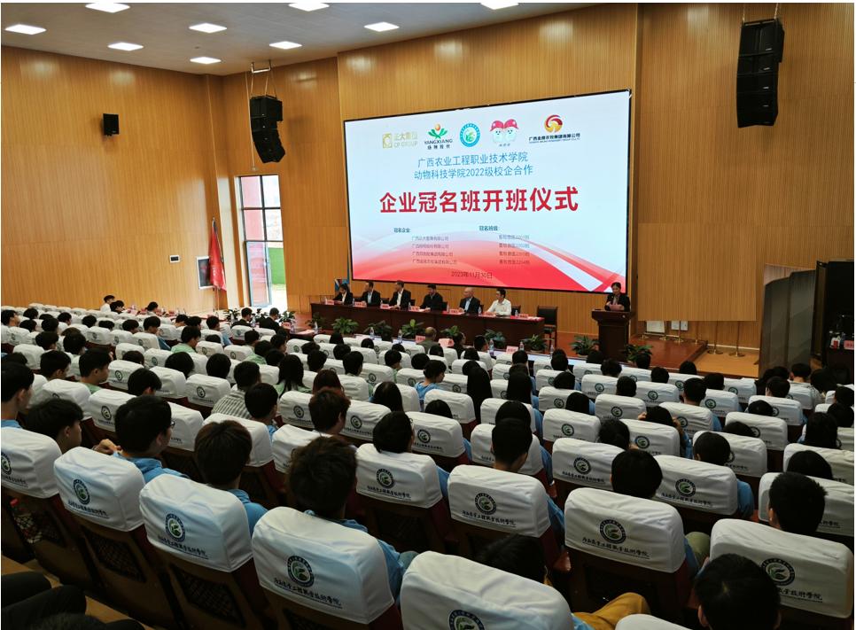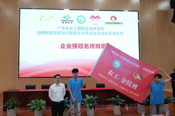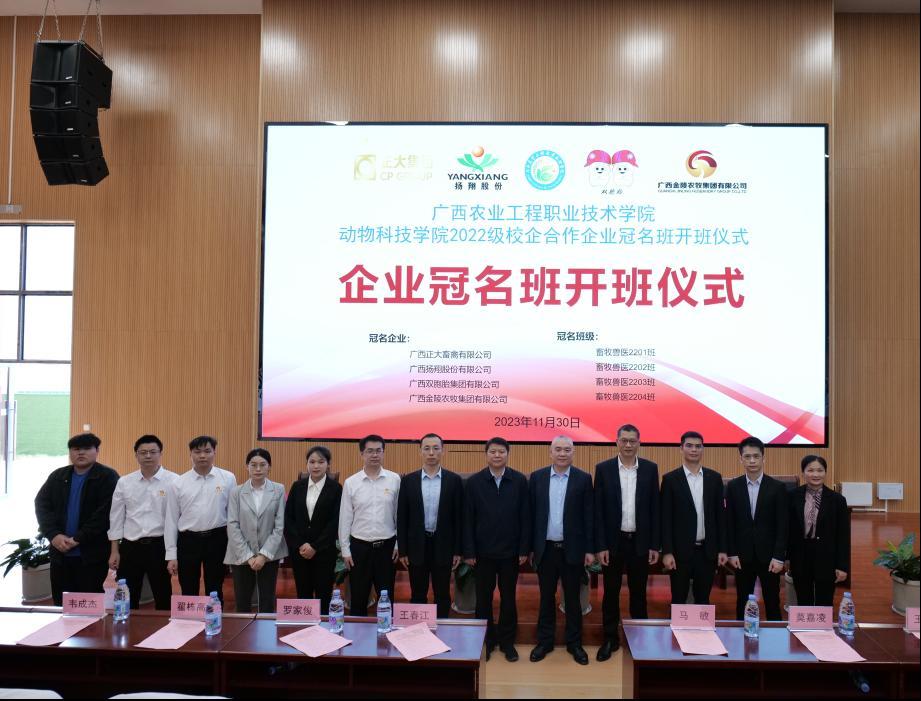 校党委书记马敏、副校长莫嘉凌、党政办主任王冬钦、教研处处长蓝宗林出席活动,动物科技学院熊艳芸副院长主持会议。广西正大畜禽有限公司、广西扬翔股份有限公司、广西双胞胎集团、广西金陵农牧集团等冠名企业代表及冠名班级学生出席活动。活动中,莫嘉凌对企业的到来表示欢迎,对冠名班设立表示支持,并鼓励冠名班的同学们珍惜机会,充分发挥专业优势,持续提升岗位能力。