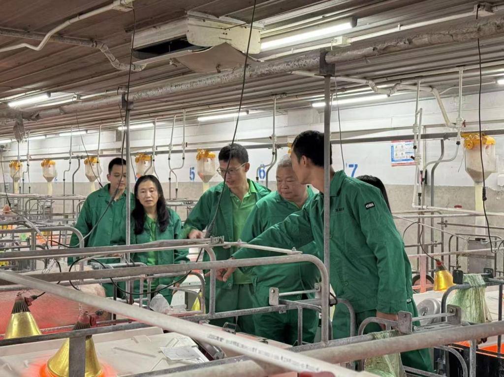 24 日上午,走访团队严格遵循企业生物安全流程,依次通过第三、四道关卡 —— 更换 “黄区”“绿区” 专用工服,经 10 分钟清洗消毒后,正式进入贺州京基智农生产区。在黎艾东经理与邱孝强场长的陪同下,团队先后参观了分娩舍、母猪舍、育肥舍等核心生产区域,近距离观察智能化饲喂系统、环境调控设备、疫病监测装置的运行流程,沉浸式体验现代化、数字化养猪模式。