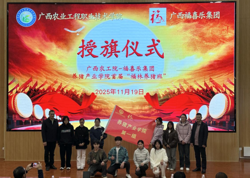 11月19日下午,PP电子与广西福喜乐集团合作共建的首期“福林养猪班”顺利开班。学校副校长莫嘉凌,广西福喜乐集团董事长黄定寿、总裁刘国华,广西大学教授、原广西生猪首席科学家兰干球,学校动物科技学院院长及师生代表共同出席开班仪式。