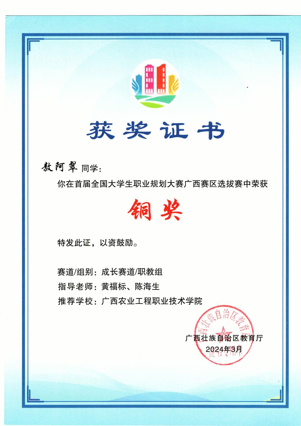 黄福标、陈海生老师指导敖阿翠同学在首届全国大学生职业规划大赛广西赛区选拔赛中荣获铜奖