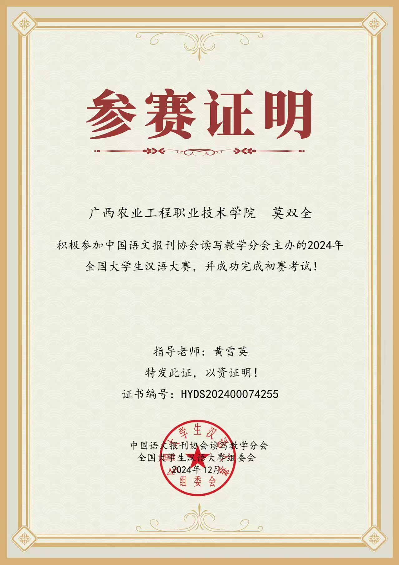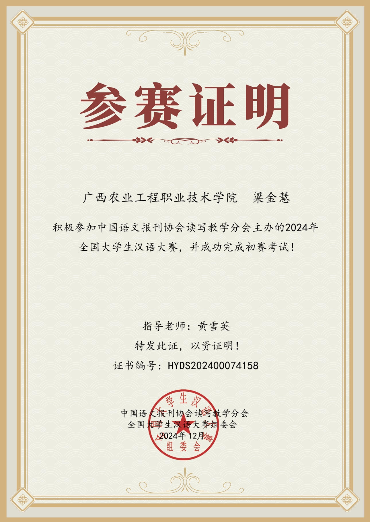 黄雪英老师指导梁金慧、莫双全、唐结凤等3名同学积极参加中国语文报刊协会读写教学分会主办的2024年全国大学生汉语大赛,并成功完成初赛考试。
