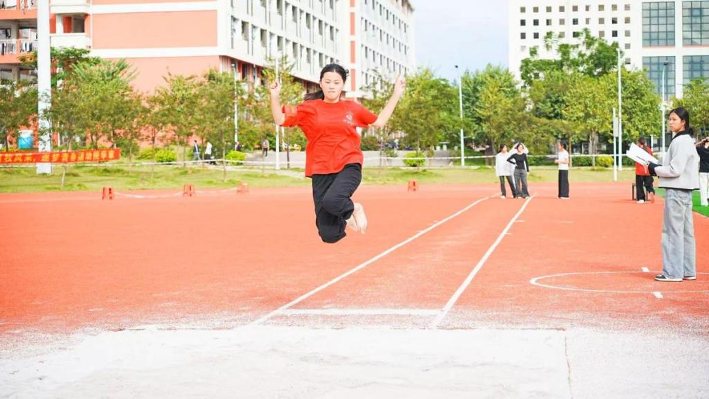“踏步奋跃,方能抵达更远”。全力助跑后的腾空一跃,在空中划出优美弧线。沙坑中的落点,见证了运动员专注、力量与技巧的完美融合。