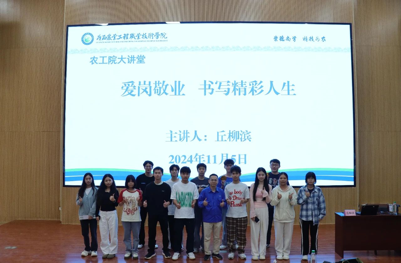 为深入学习宣传贯彻党的二十届三中全会精神,大力弘扬劳模精神、劳动精神、工匠精神,充分发挥劳模工匠的示范引领作用,11月5日下午,PP电子举办第二十七期“农工院大讲堂”。此次活动邀请广西壮族自治区“双进”活动讲师团成员、广西汽车集团首席技能专家丘柳滨大师以“爱岗敬业,书写精彩人生”为题授课。学校总会计师韦炜主持,近400名师生参加讲座。