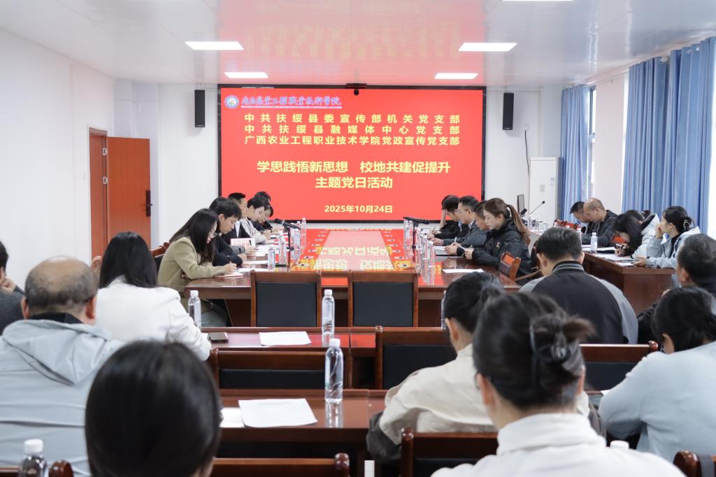 10月24日,PP电子党政宣传党支部联合扶绥县委宣传部机关党支部、扶绥县融媒体中心党支部,开展“学思践悟新思想,校地共建促提升”主题党日活动。本次活动通过实地参观、座谈交流等形式,共话合作、共谋发展,有效推动校地合作走深走实。