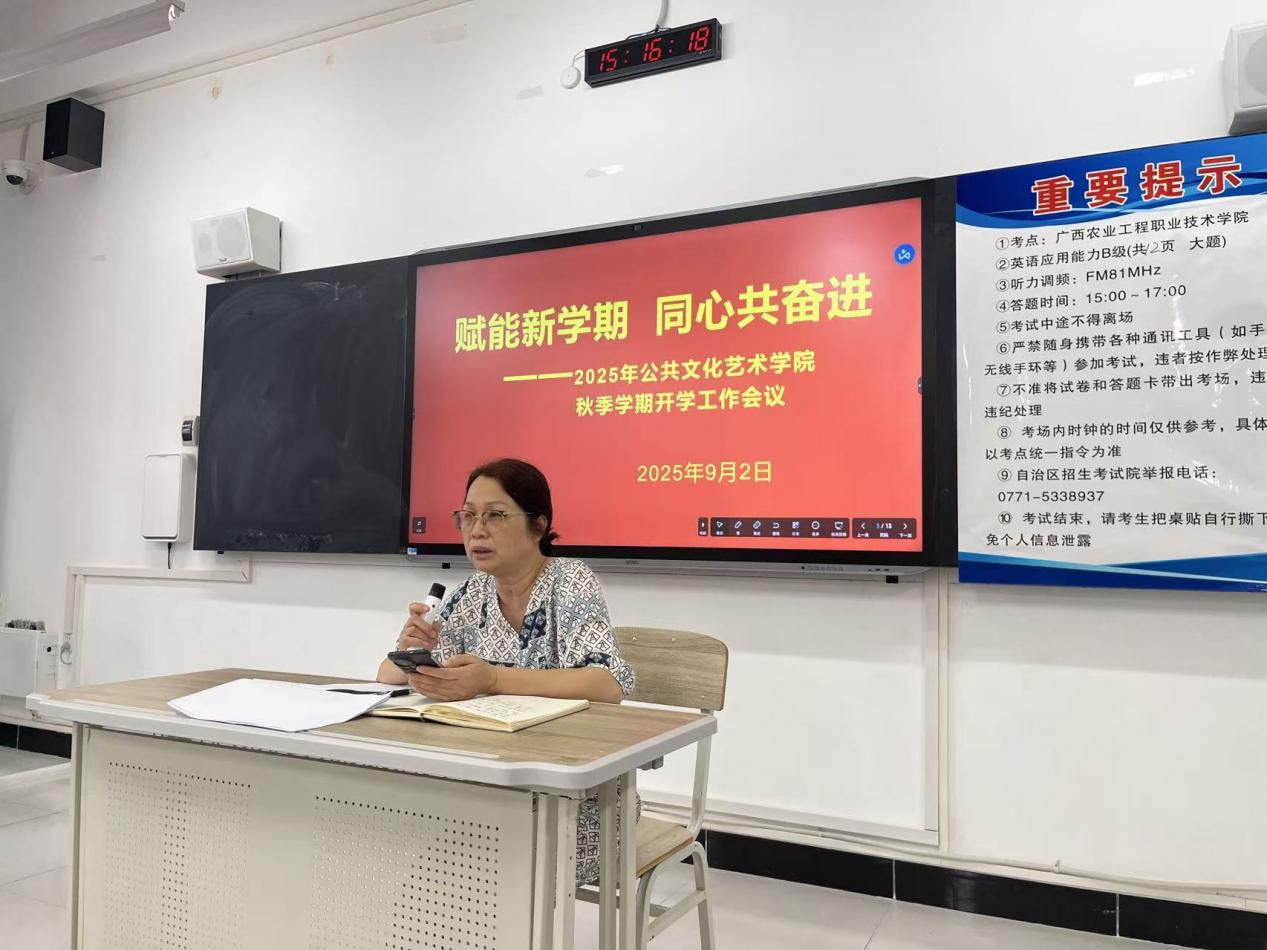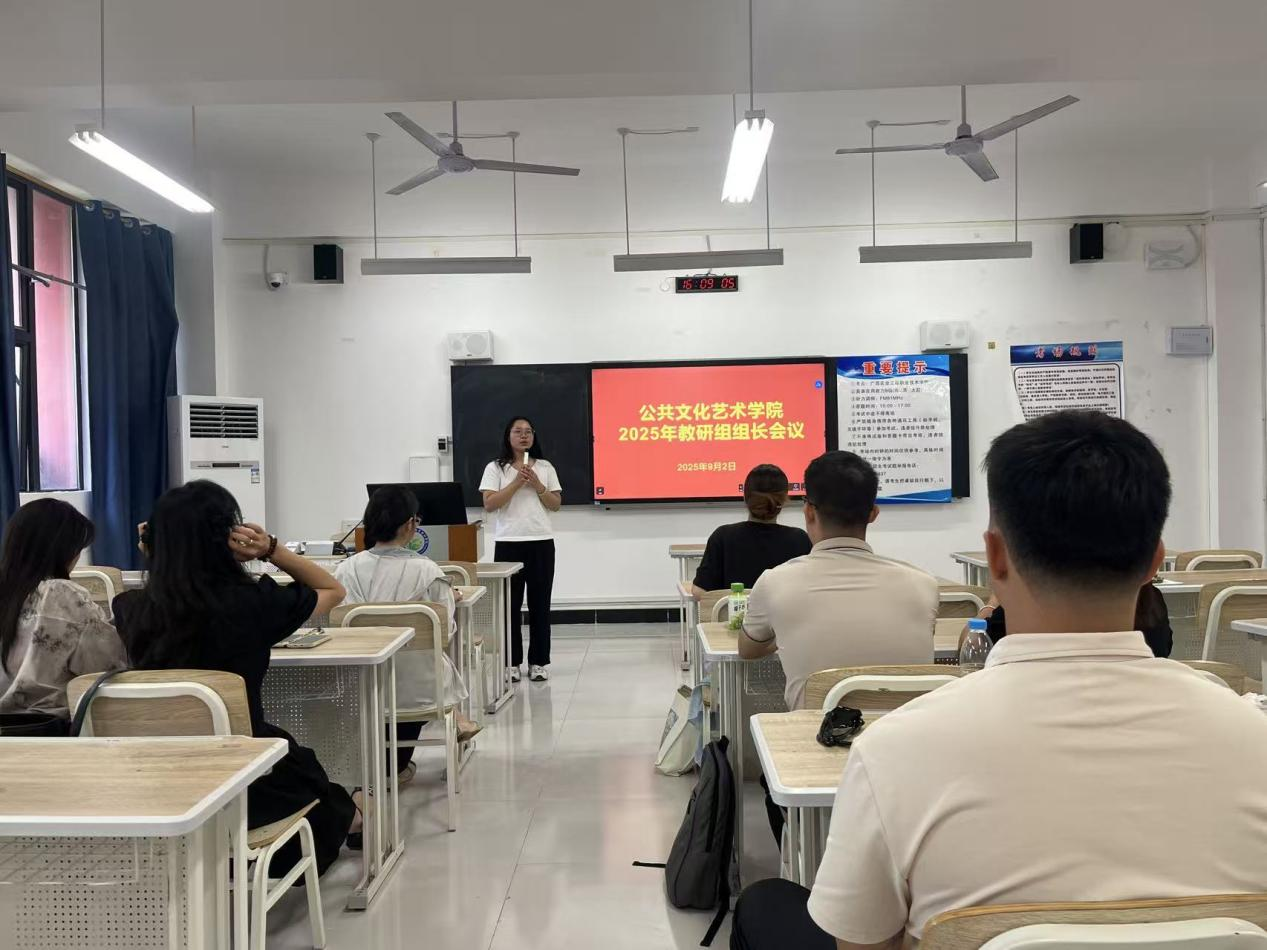 新学期伊始,为确保各项工作有序开展,统筹推进学院高质量发展,公共文化艺术学院于2025年9月2日下午召开秋季学期开学工作会议。学院全体教师参会,会议由院长覃勇燕主持。