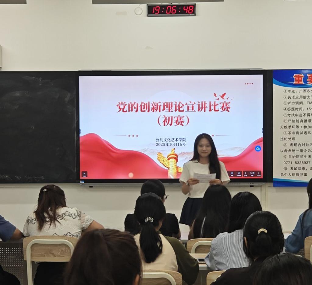为深入学习宣传贯彻党的创新理论,引导广大师生深刻领会其核心要义与实践要求,激发奋进新征程、建功新时代的磅礴力量,2025年10月16日晚上,公共文化艺术学院在3-205举行“党的创新理论宣讲比赛”二级学院海选活动。