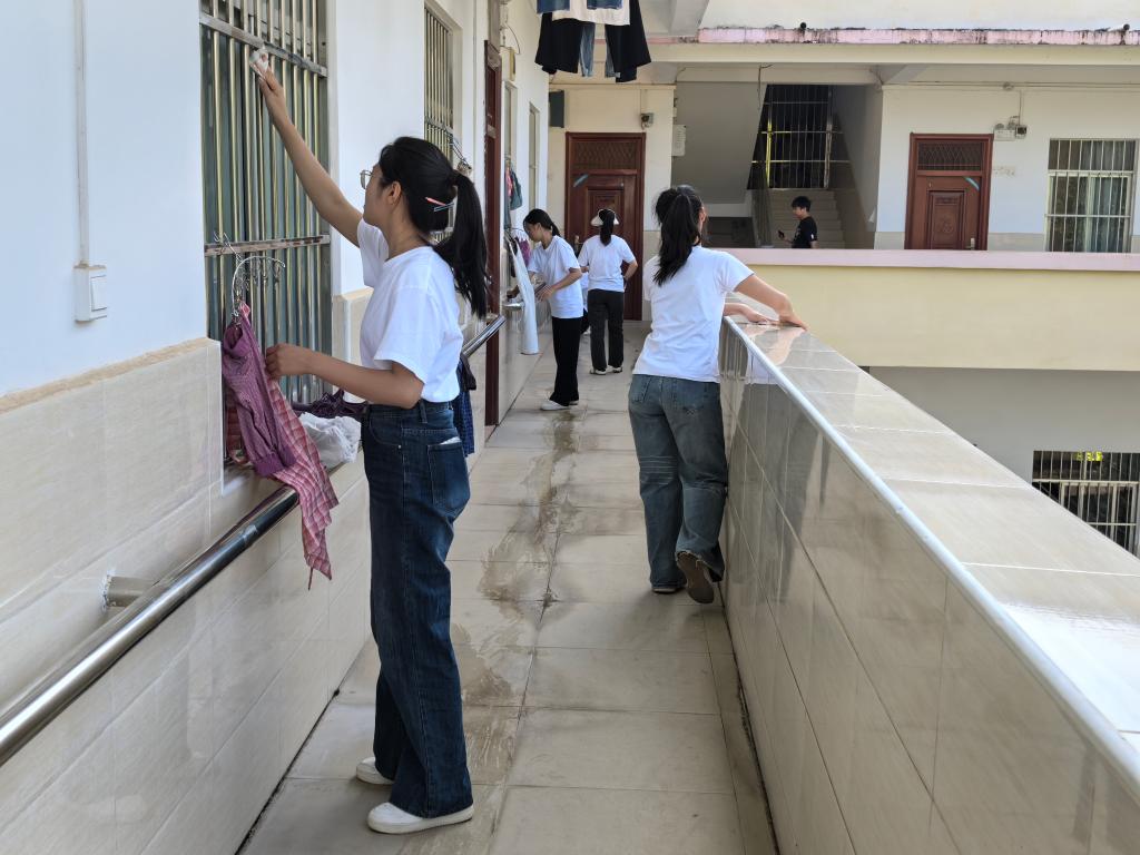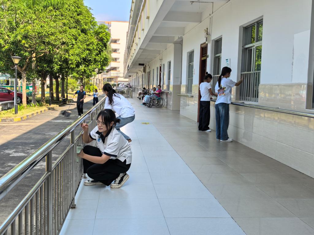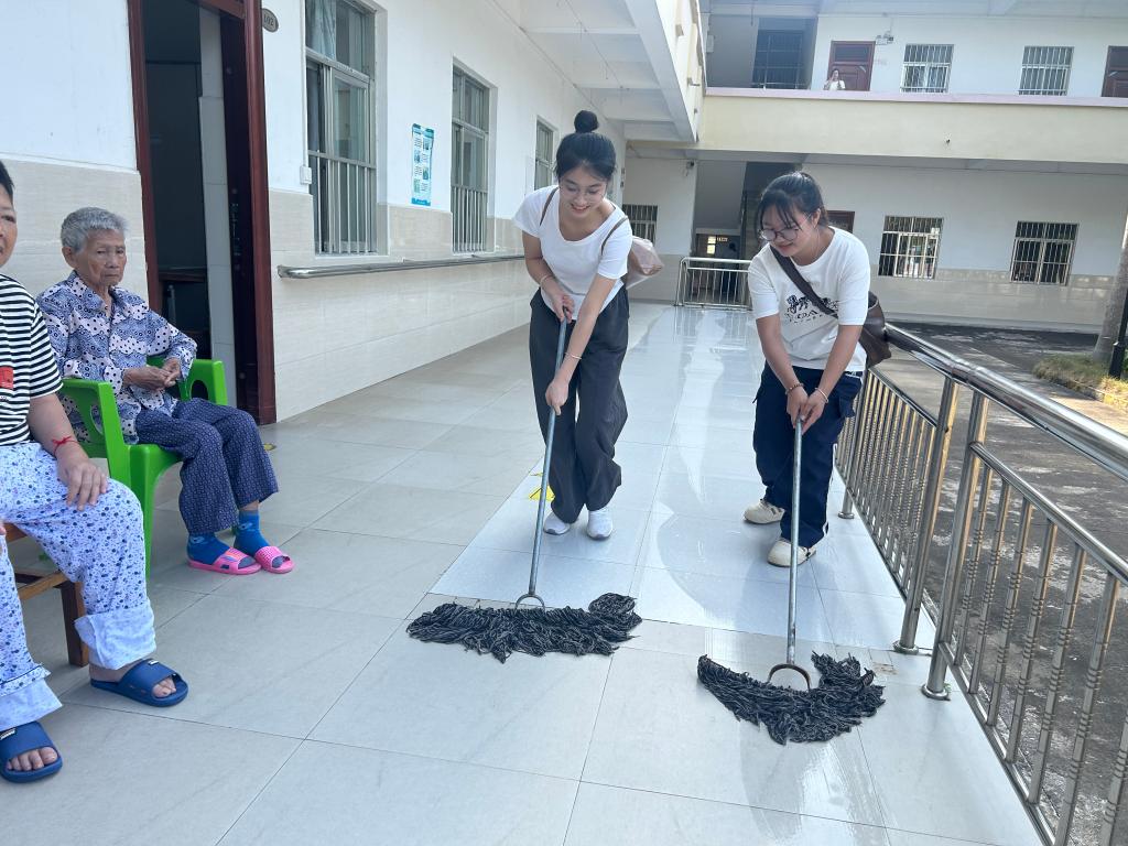 活动现场,公共文化艺术学院党支部党员、积极分子认真耐心地为福利院的老人们扫地、拖地、擦拭栏杆。
