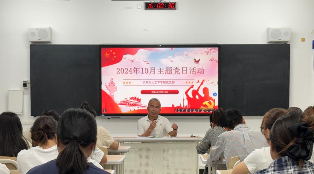 为进一步提高党支部成员思想理论水平,及时深入学习新理论、新思想,2024年10月15日下午,学校副校长李祖培到公共文化艺术学院党支部开展”强化教育根基,助力民族团结“主题党课活动。