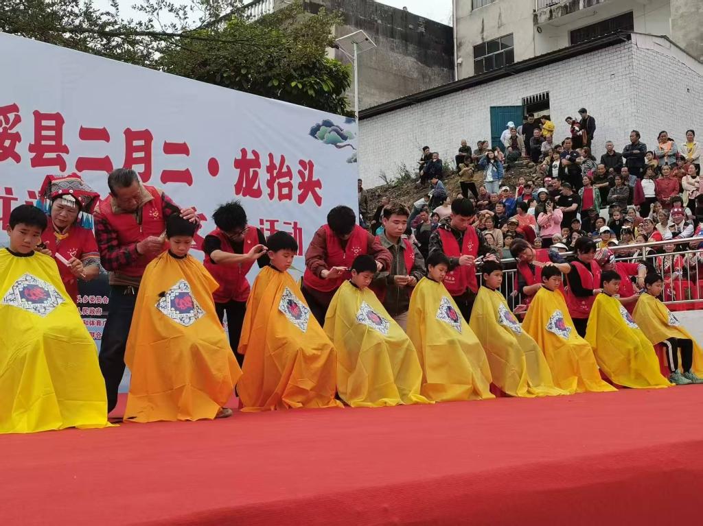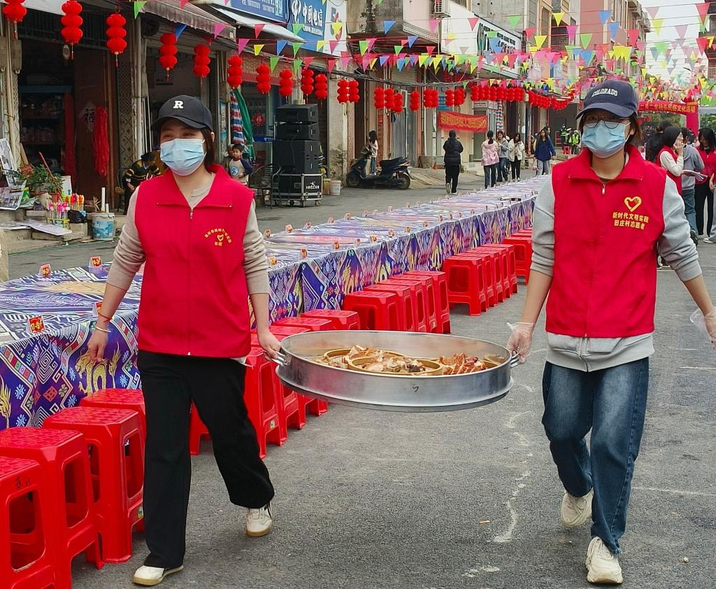 在震天的迎宾鼓声中,志愿者们身着统一红马甲,迅速投入志愿服务。当九条草龙在点睛仪式中"醒龙"时,志愿者们主动为群众讲解"龙文化"内涵;游龙队伍穿街巡游时,志愿者们自发维护起秩序,确保传统仪式顺利进行。活动现场,学校理发协会的同学发挥专业特长,为村里儿童开展"剃龙头"民俗理发服务。二月二剃龙头,既是祛旧迎新的民俗,更寄托着人民对美好生活的向往。在长龙宴筹备现场,志愿者协助乡民制作龙头白糕、布置民俗展台,将热气腾腾的传统文化"端"上百姓餐桌。