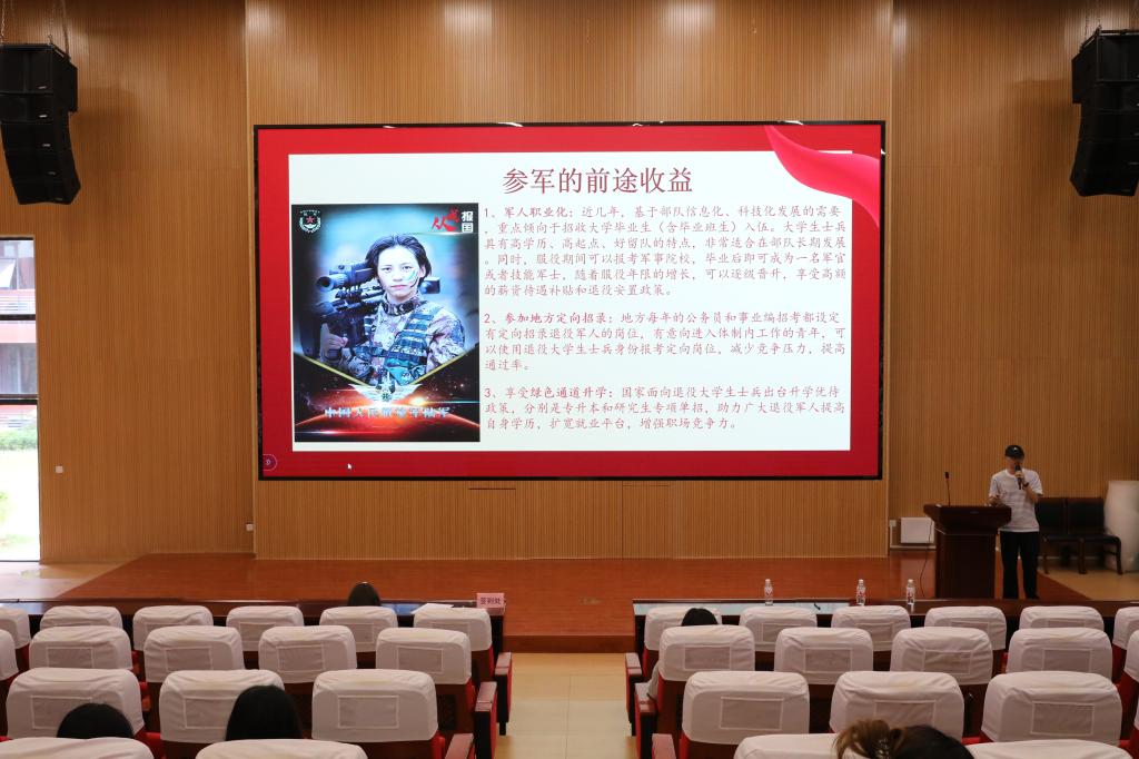 会上,学院学工助理谢军生为在场学子带来了一场别开生面、振奋人心的大学生参军政策宣讲与动员,将个人发展与家国情怀紧密相连,为同学们的升学规划注入了新的思考维度。他巧妙地将学历提升指导与家国情怀教育相融合,引导多元成才路径的责任担当,同时展现了学院全方位服务学生成长。