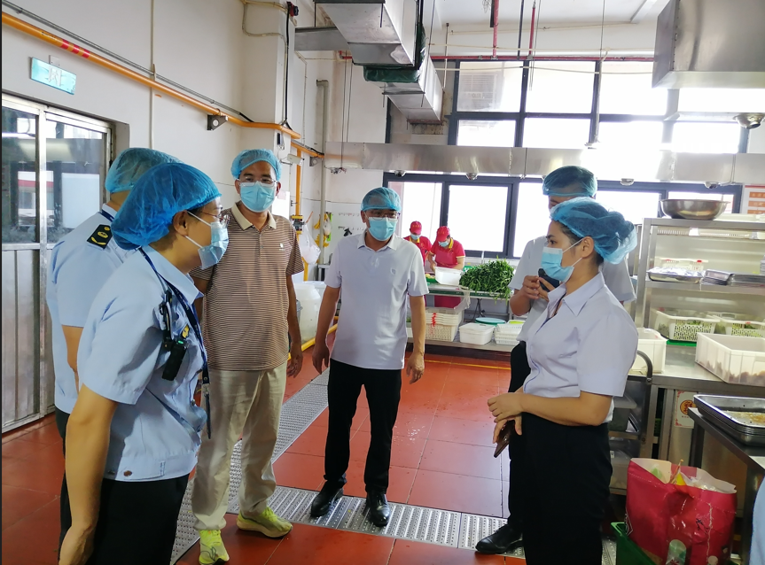 联合检查组深入食堂后厨实地查看环境卫生、食品加工、储存冰箱温度、关键控制点体系建立和实施等情况,检查“日管控、周排查、月调度”台账、留样台账、进货查验等食品安全管理台账。