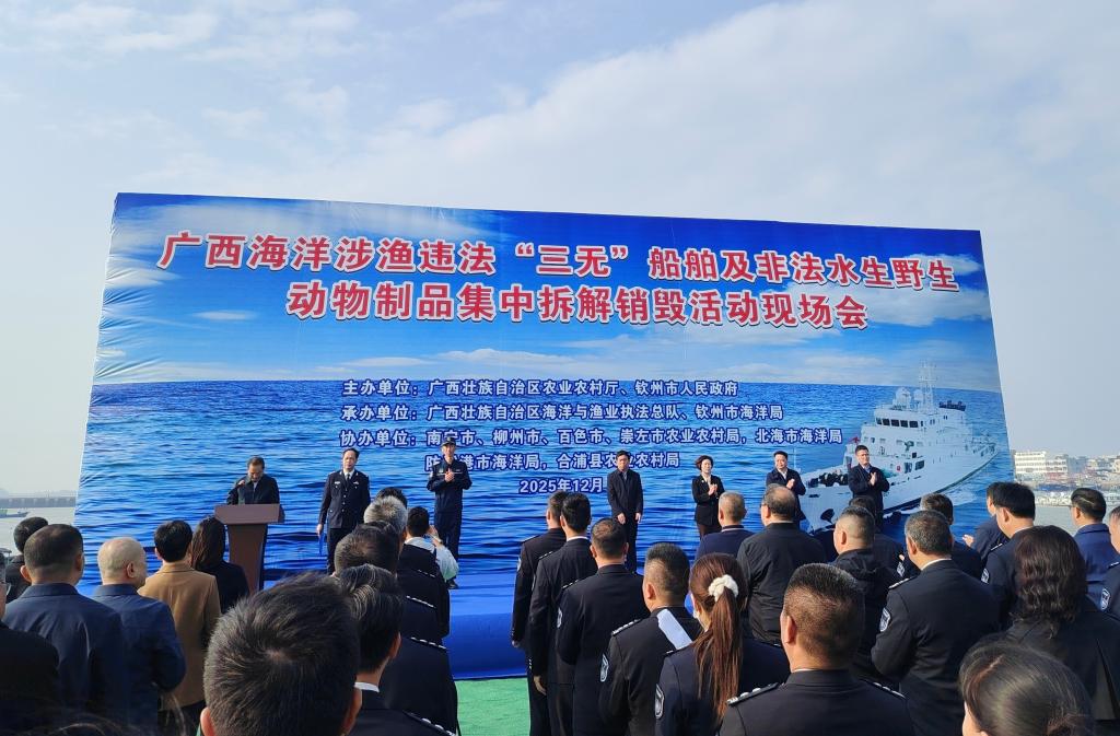 2025年12月5日,由广西壮族自治区农业农村厅、钦州市人民政府主办,广西壮族自治区海洋与渔业执法总队、钦州市海洋局承办的“广西海洋涉渔违法‘三无’船舶及非法水生野生动物制品集中拆解销毁活动现场会”在钦州市举行。海洋与渔业学院负责人农新闻带队,一行4名教师代表前往现场进行了观摩学习。
