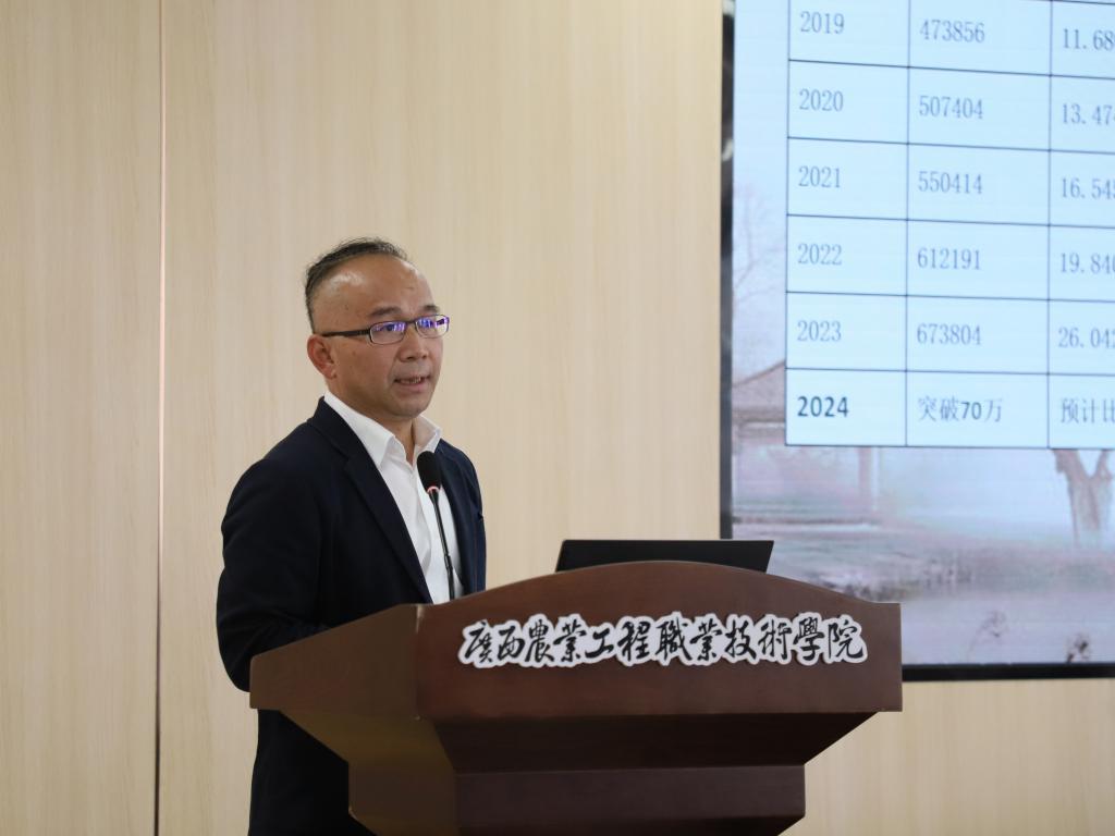 马敏首先对此次参会人员的到来表示热烈的欢迎,随后从办学历史、专业设置、实训建设、发展目标等方面对PP电子进行介绍。马敏表示,职业教育对促进就业创业、助力经济社会发展具有重要意义,要抢抓机遇,推动广西农业职业教育高质量发展。为更好推进“深度合作,携手发展”,实现资源共享、优势互补,马敏提出几点建议:一是加强交流与沟通,打破壁垒,消除障碍。二是强化农业类中高职衔接,完善职业教育体系。三是加强校校合作和校企合作,推动实训基地共享。四是加强人才培养,为农业现代化提供坚实的人才保障。五是加强教育优质资源建设,以农业职业教育产教融合赋能农业产业高质量发展。