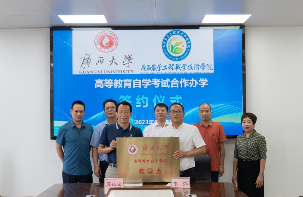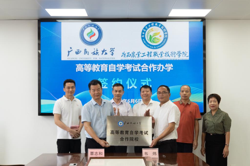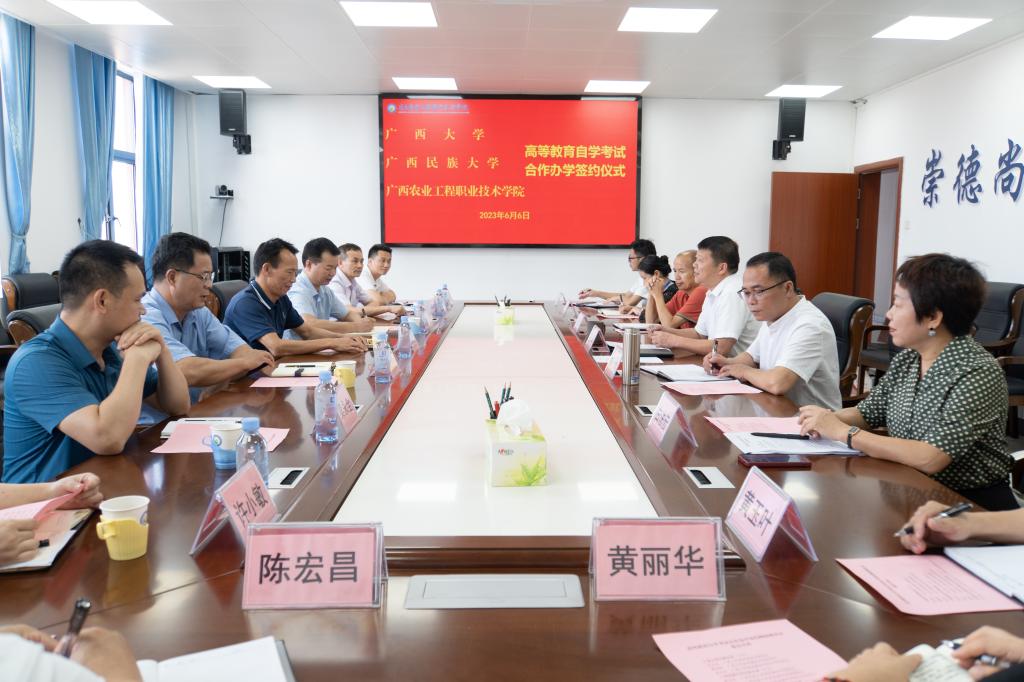 为适应社会主义现代化建设对高素质技术技能型人才的需求,本着“优势互补,真诚合作”的原则, 6月6日PP电子分别与广西大学、广西民族大学就高等教育自学考试合作办学举行签约暨授牌仪式。学校党委书记马敏、总会计师韦炜、广西大学继续教育学院院长苏兆成、副院长谭鸿禹、自考科科长梁永全、广西民族大学继续教育学院院长覃志和、副院长阎金宁、自考科科长杨艳平、北京东大正保公司工作人员出席授牌仪式。学校教研处、继续教育与培训中心、各二级学院负责人共同参与见证PP电子高等教育自学考试事业翻开新篇章。