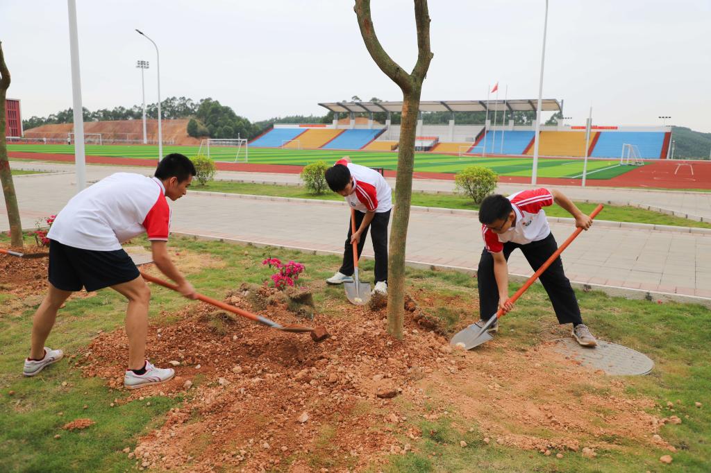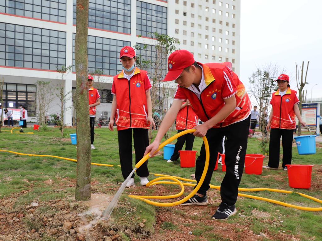 在活动现场,全体师生分工协作,干劲十足,认真完成正苗、培土、浇水等各项工作,共携手种下80棵树苗。