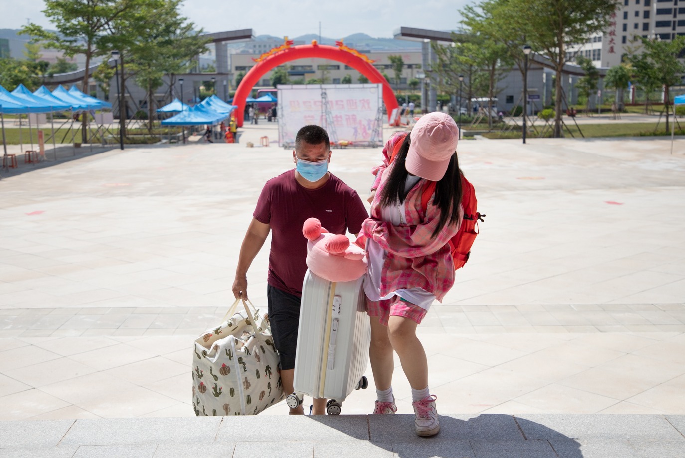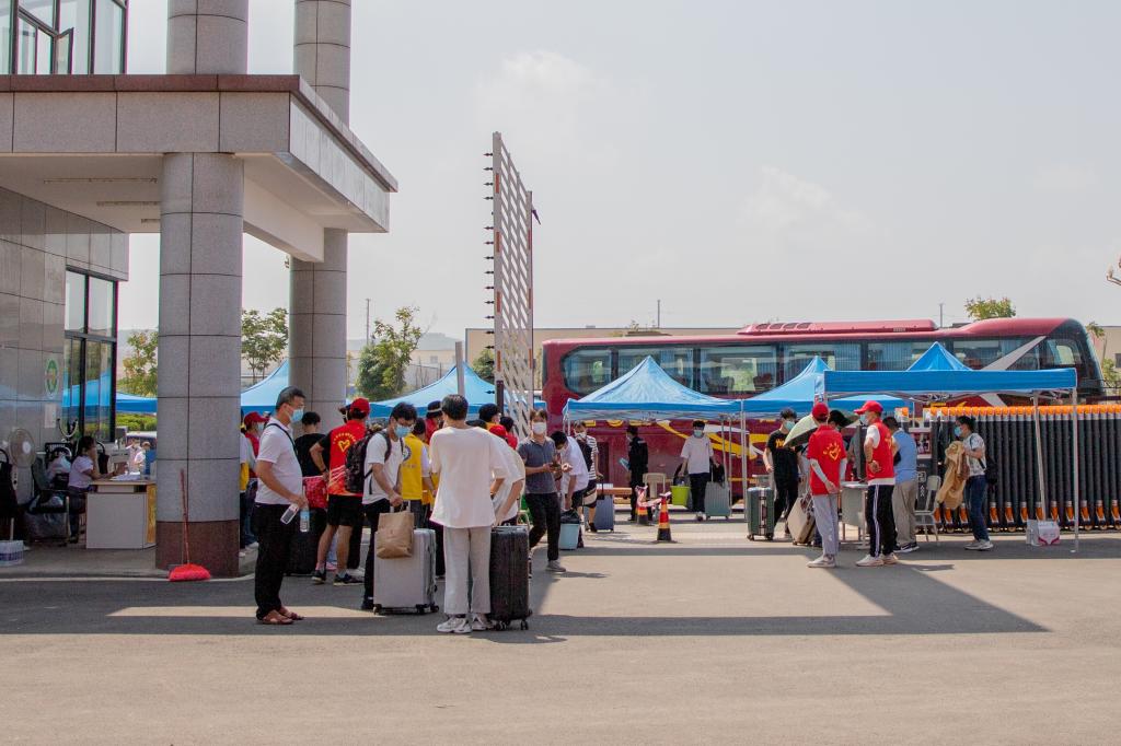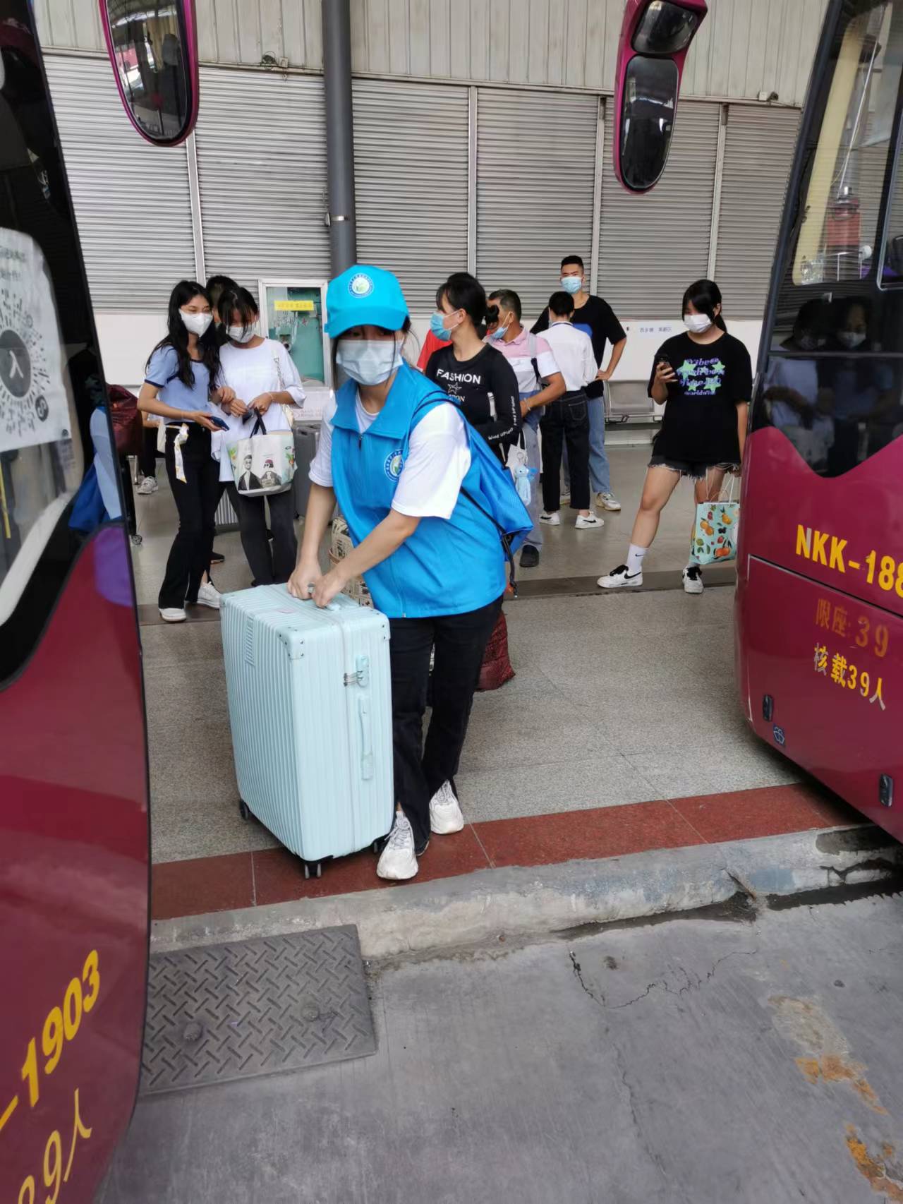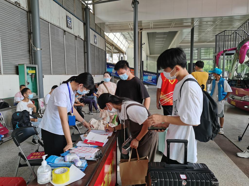 老师和志愿者们在车站迎接