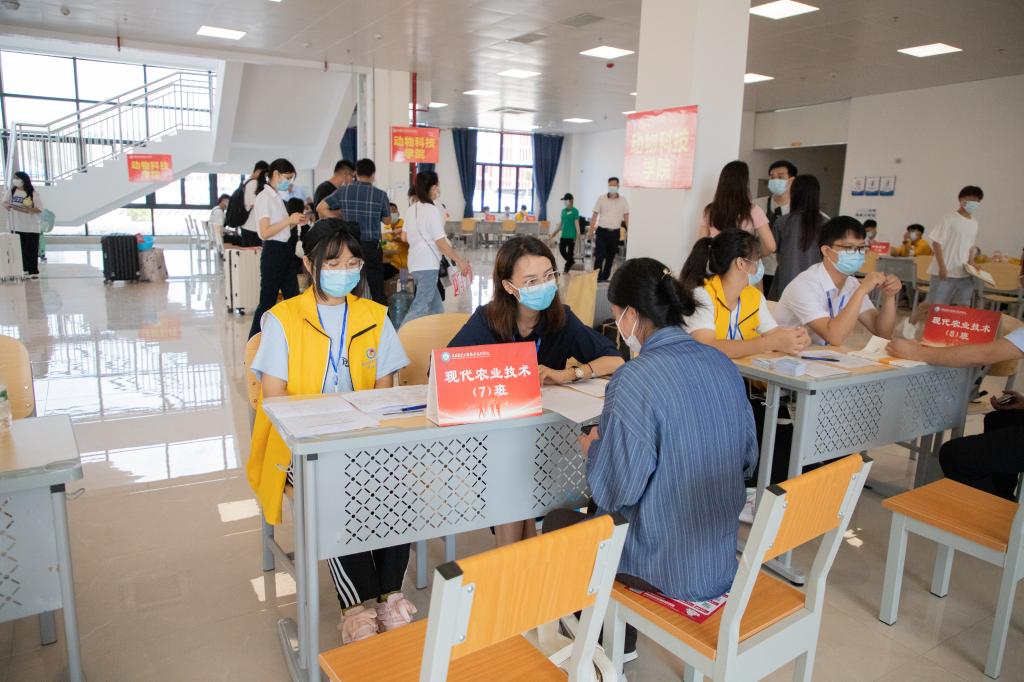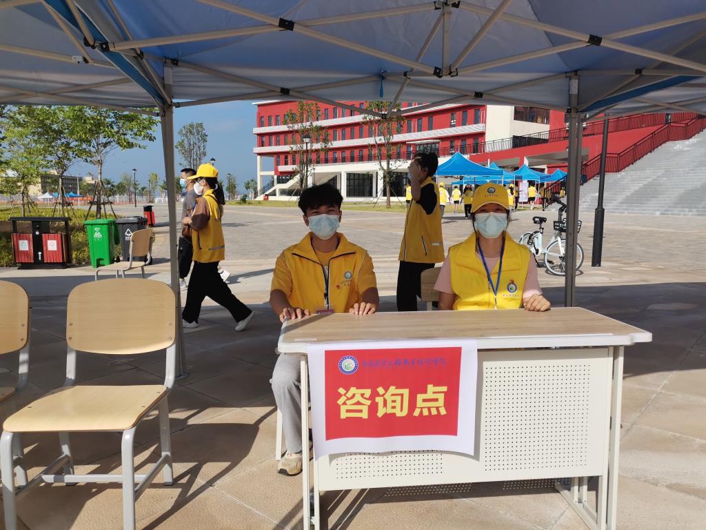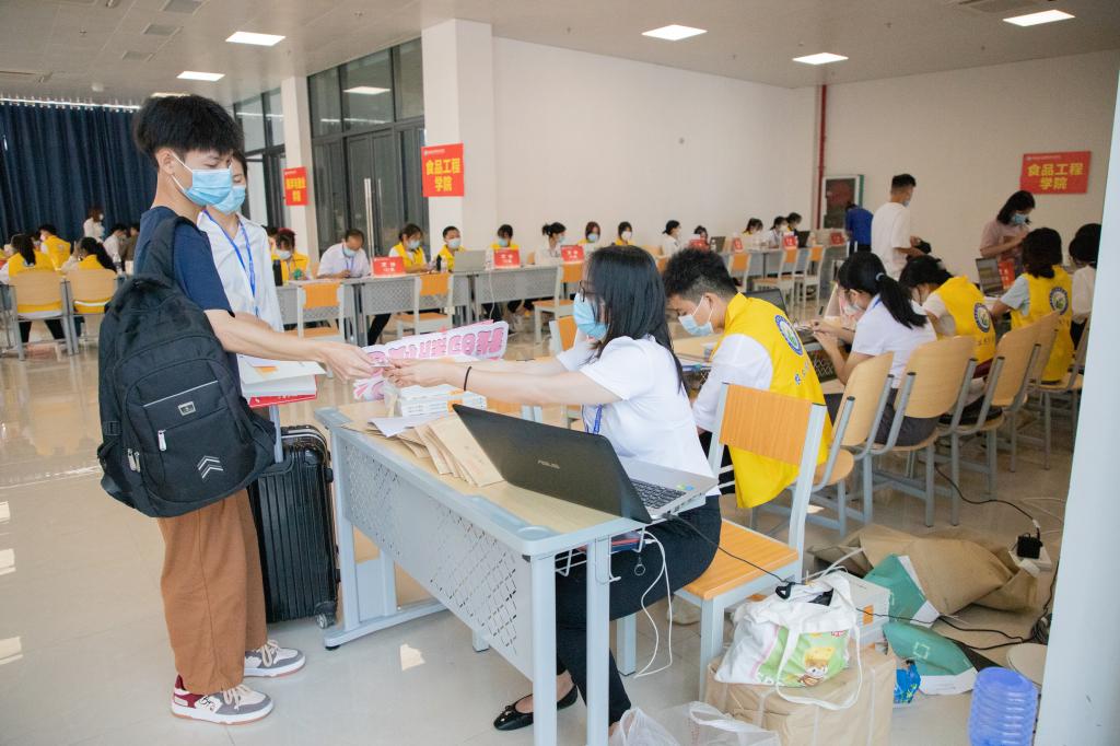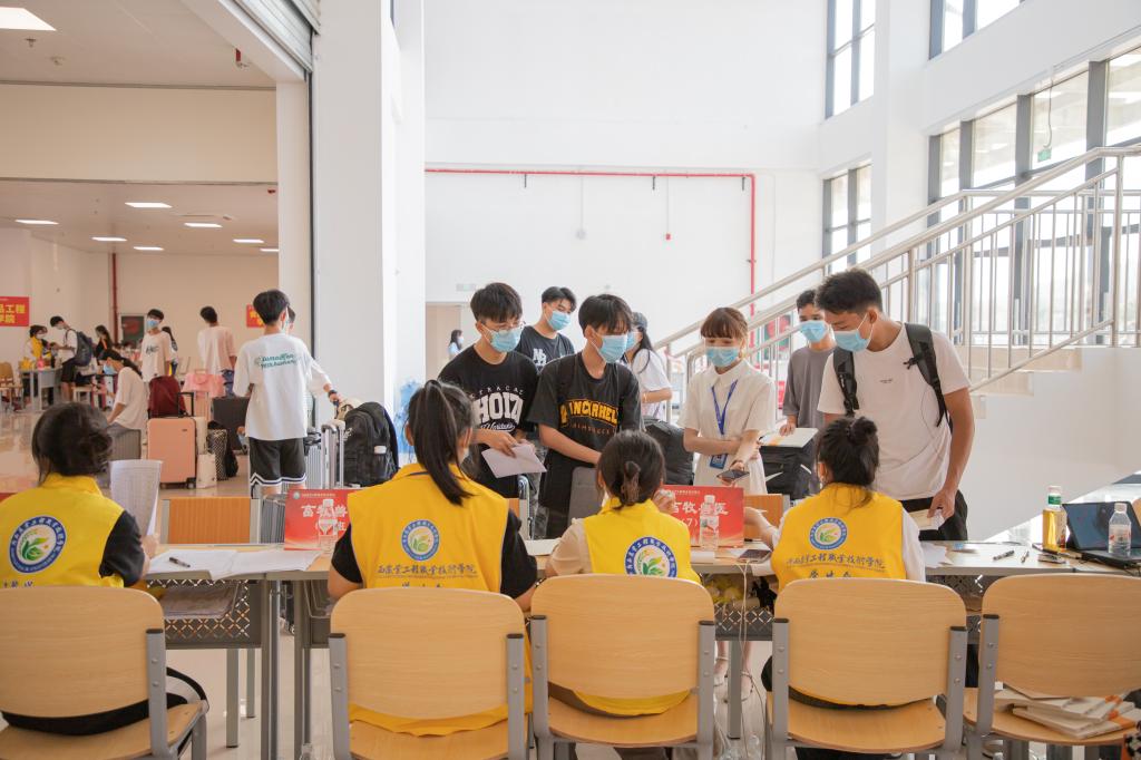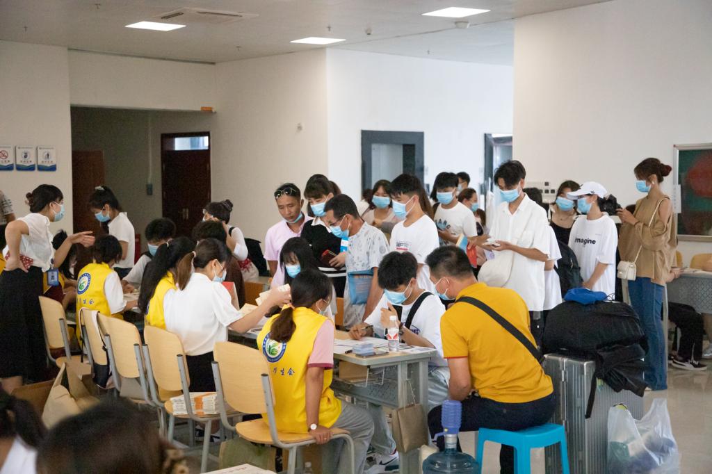早上7点左右,学校相关部门工作人员、各二级学院教师及身着不同颜色工作服的学生志愿者们早早到位,准备迎接新生。有新生的地方就有志愿者的身影,每当看见新生到校,他们便会主动接过家长手中的行李,护送新生到校门测温,出示健康码、行程卡、48小时核酸检测结果,进校后由学生志愿者们接引到图书馆一楼内的迎新接待服务点办理入学手续,然后将新生们送上校园摆渡车直达宿舍区。志愿者们全过程守护,为新生报到提供引导,帮助他们搬运行李、寻找宿舍位置,志愿者们躬先表率,为学弟学妹们周到热情地服务。