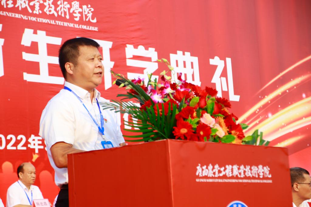 典礼在高亢激昂的国歌声中正式拉开帷幕。党委书记马敏首先对新同学的到来表示热烈的欢迎,介绍了职业教育的发展以及学院概况,希望同学们一要怀爱国心,立报国志;二要爱校如家,以校为荣;三要热爱专业,矢志为学;四要尊师爱友,团结互助。发扬“崇德尚学,精技为农”的校训精神,矢志不渝,为建设壮美广西、共圆复兴梦想做出自己应有的贡献