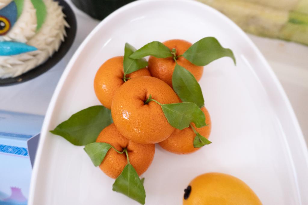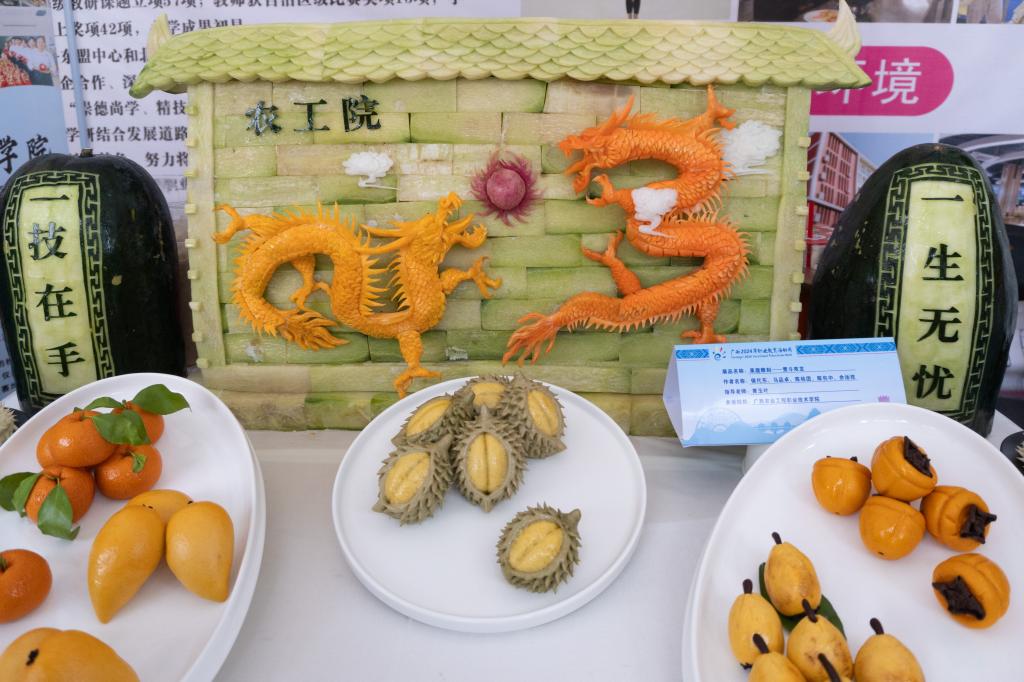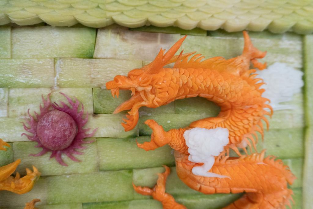“贯斗双龙”果蔬组合雕刻以及象形面果展示