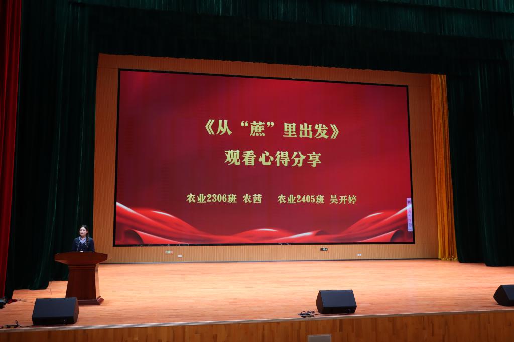 活动还展映了两部校外优秀作品《从“蔗”里出发》和《青春向“新”而行,筑梦农业强国》,现场邀请学生分享观后感。“当看到思政课教师带领学生走进甘蔗地,无人机掠过连片的蔗田,生物技术让糖分在根系中悄然沉淀的瞬间,我忽然明白,真正的'长衫'不是学历的枷锁,而是将知识化作破土而出的力量,我们学的不仅是技术,更是服务乡村振兴的责任!”现代农业技术专业2306班的农茜同学的一番感言,引发全场共鸣。
