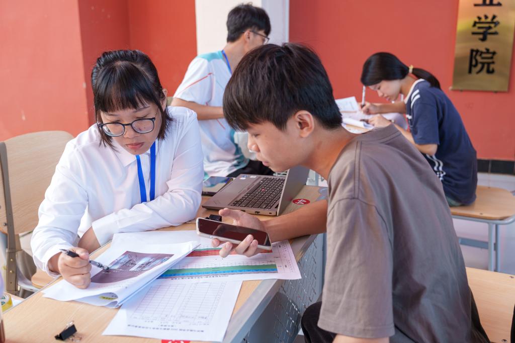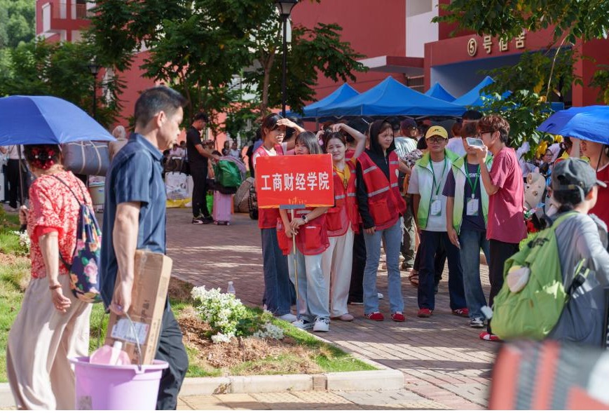 刚踏进校门,晨光中便跃动起一抹抹明亮的志愿者红——身穿红背心的志愿者们迅速迎上前,有的帮忙提行李,有的耐心指引报到流程,还有的热情为新生和家长递上解渴的水。他们忙碌的身影在雨中穿梭,他们踮脚张望的身影与滴落的汗珠共舞,构成了一道温暖而动人的风景线,让初来乍到的新生和家长们感受到了关怀与温暖。
