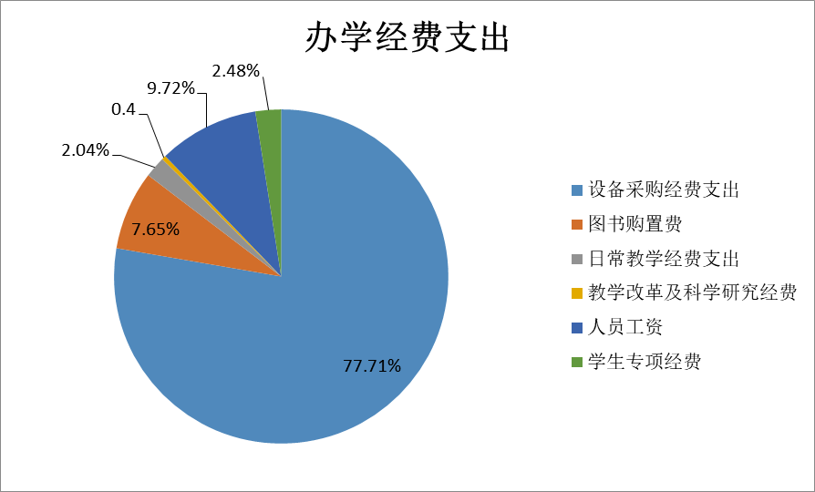 二是办学经费总支出。2022年度,PP电子游戏网站办学经费总支出共计2483.56万元。其中:设备采购经费支出1930万元,占比77.71%;图书购置费190万,占比7.65%;日常教学经费支出50.69万元,占比2.04%;教学改革及科学研究经费10万元,占比0.4%;人员工资241.39万元,占比9.72%;学生专项经费61.47万,占比2.48%。2021年度办学经费支出情况如下表: