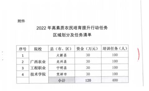 2022年10月,自治区农业农村厅与学校签订《2022年高素质农民培育提升行动委托培训协议书》,委托学校在崇左市等4个县(区)开展新型农业经营主体和服务主体培训、返乡入乡创新创业者培训等高素质农民和乡村发展人才培训工作,培训时间从 2022年10月起至2022年12月止,培训人数共计400人。培训项目经费120万元。