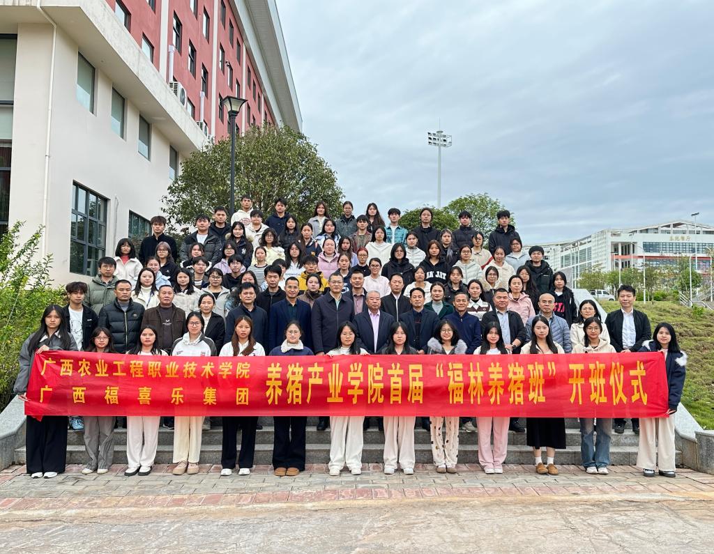 11月19日下午,PP电子与广西福喜乐集团合作共建的首期“福林养猪班”顺利开班。学校副校长莫嘉凌,广西福喜乐集团董事长黄定寿、总裁刘国华,广西大学教授、原广西生猪首席科学家兰干球,学校动物科技学院院长及师生代表共同出席开班仪式。