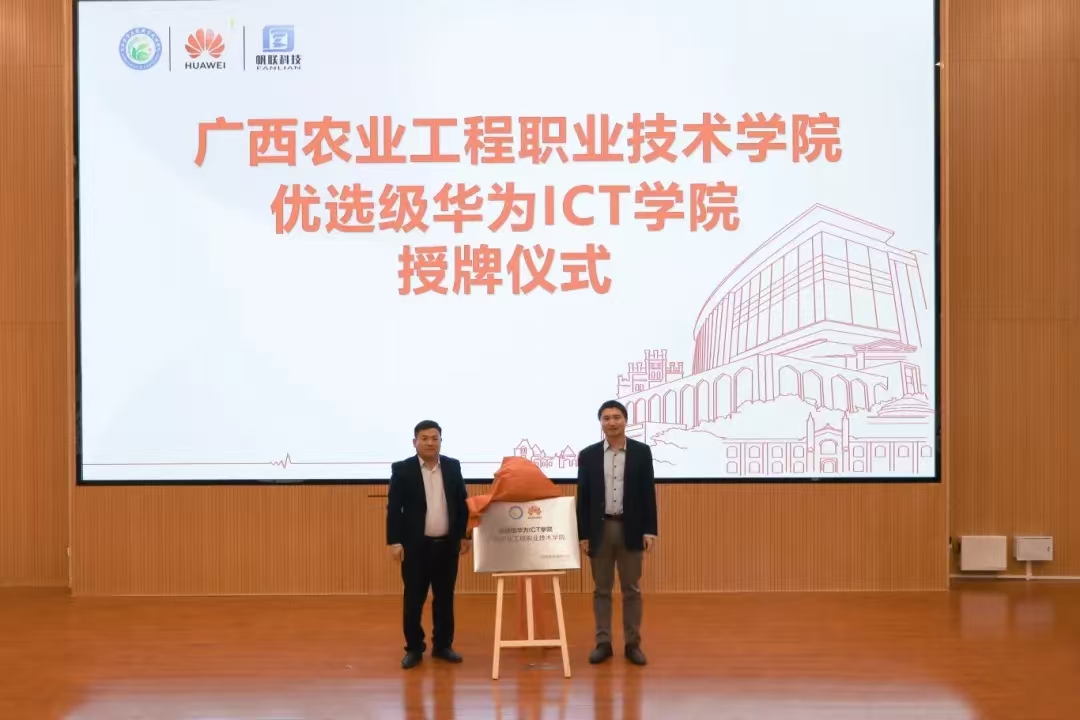 ▲学校党委副书记、校长李振科和华为广西副总经理共同为优选级华为ICT学院揭牌