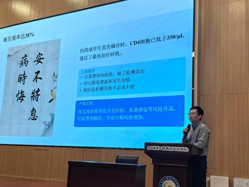 韦炜在讲座上致辞,对活动组织者和授课专家表示感谢与欢迎。他指出,大学生正处于观念成熟与社交活跃的关键时期,掌握科学的防艾知识至关重要。他鼓励同学们珍惜学习机会,将知识内化于心、外化于行,争做防艾知识的宣传员。