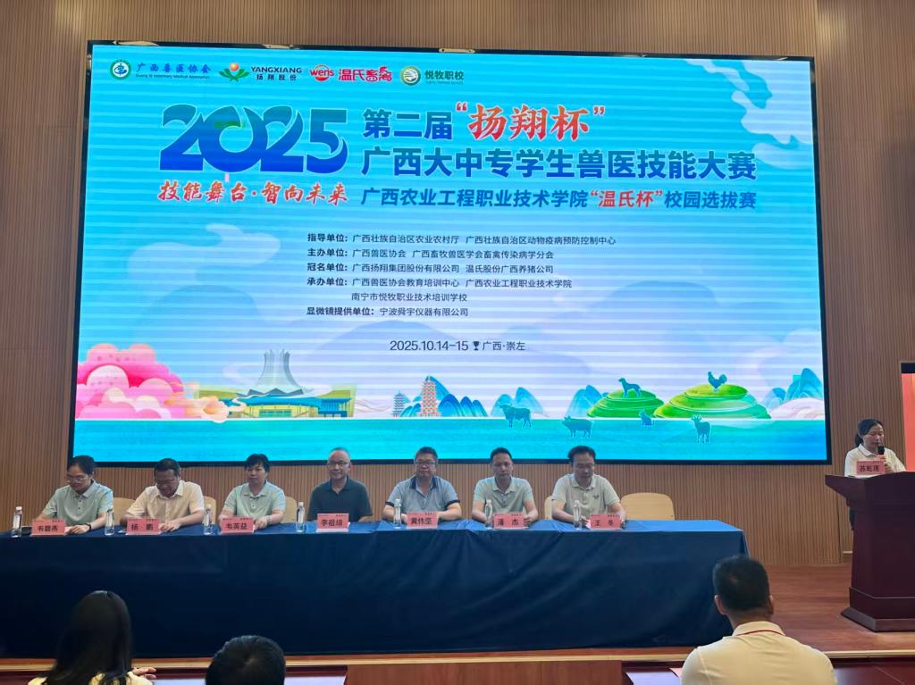 10月14—15日,2025年第二届“扬翔杯”广西大中专学生兽医技能大赛“温氏杯”校园选拔赛在PP电子成功举办。学校副校长李祖培、广西兽医协会会长黄伟坚、副秘书长韦英益、常务理事潘杰,教育培训中心主任韦碧燕,温氏股份广西养猪公司经理杨鹏、宁波舜宇仪器有限公司华南区经理王冬以及学校动物科技学院专业教师出席了启动仪式,会议由动物科技学院副院长主持。