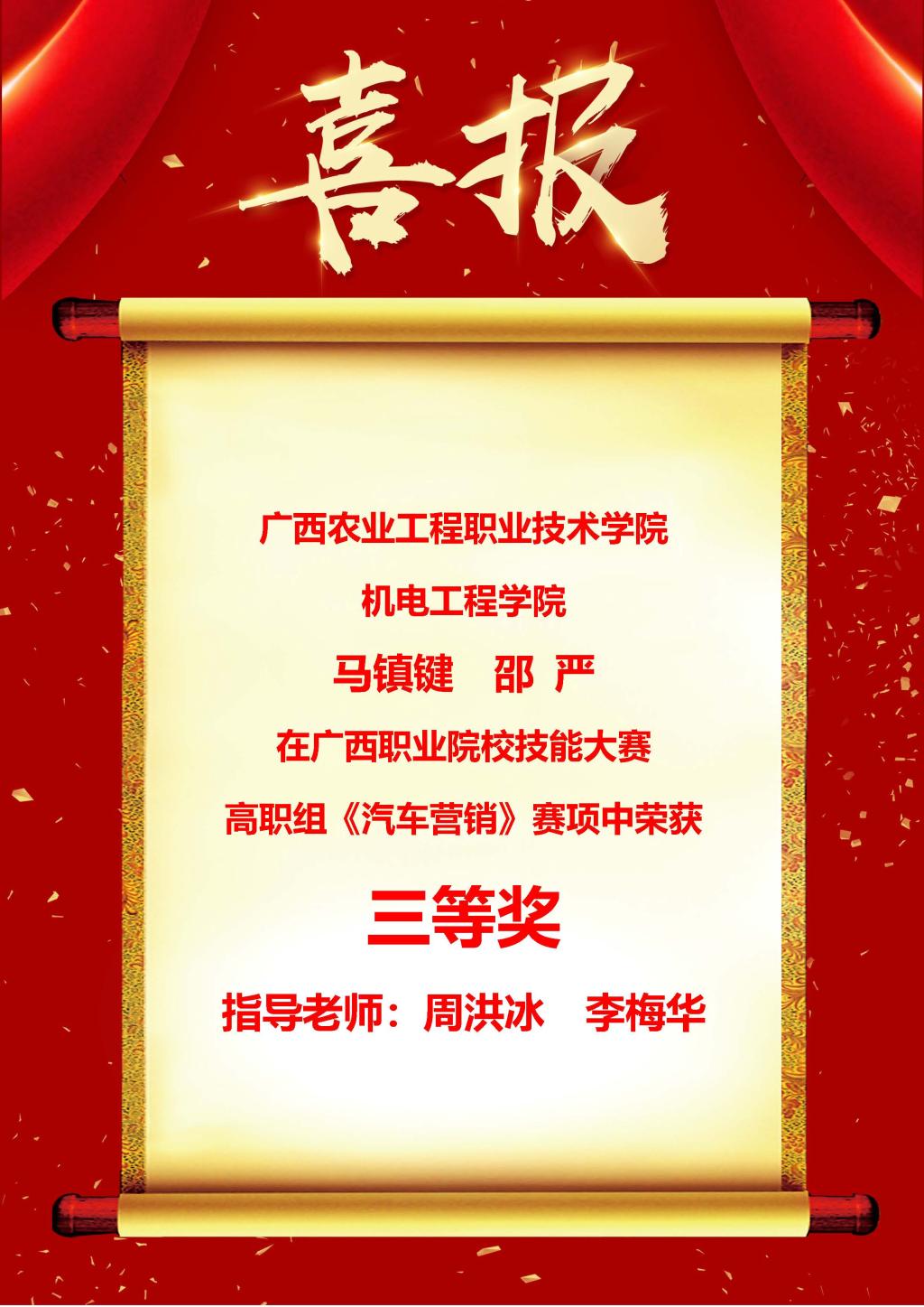 PP电子机电工程学院汽修代表队今年首次参加汽车营销赛项,参赛选手马镇键、邵严两名同学在周洪冰和李梅华老师的精心指导下,经过一个多月的认真备战和刻苦训练,在比赛中发挥良好,最终获得汽车营销技能大赛团体三等奖。