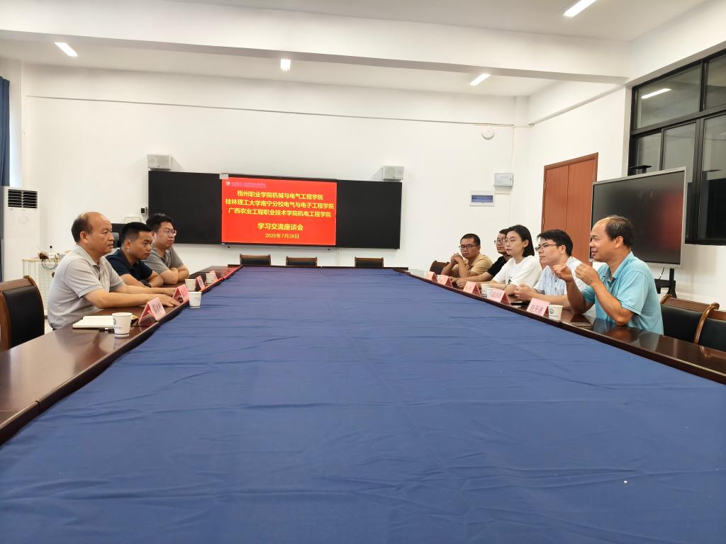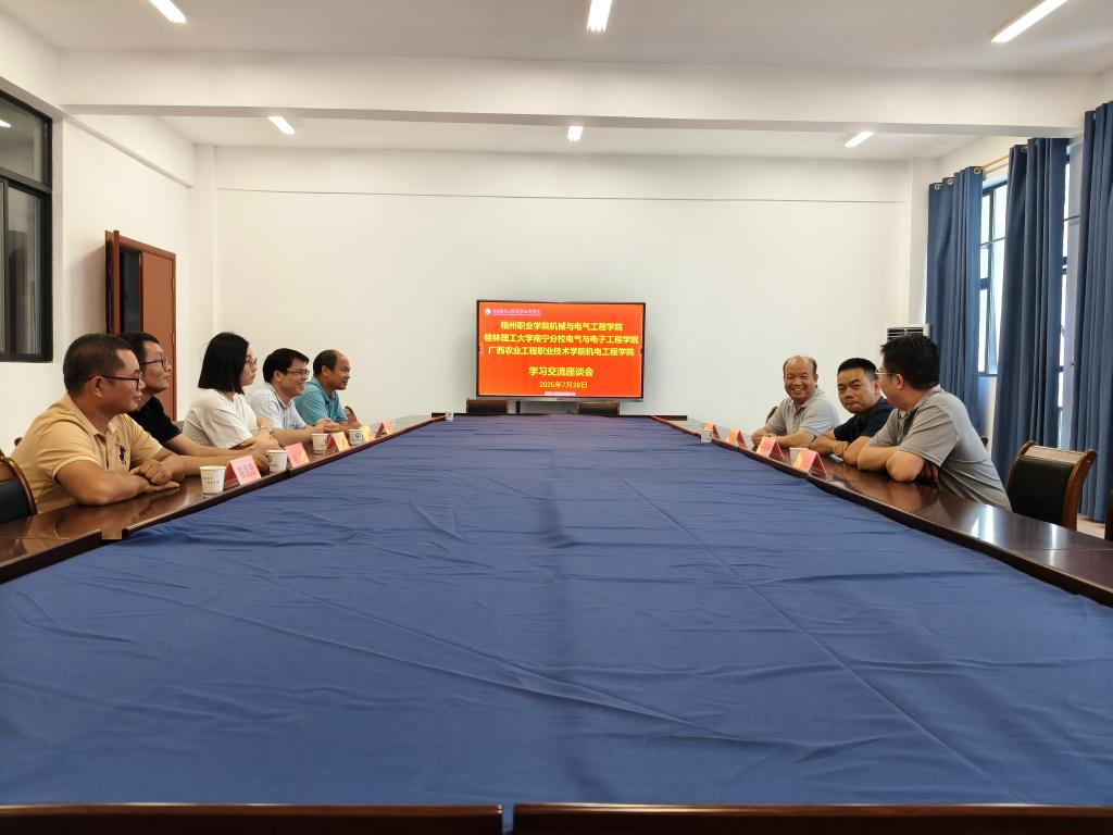 2025年7月28日,梧州职业学院机械与电气工程学院、桂林理工大学南宁分校电气与电子工程学院一行7人到访PP电子机电工程学院,围绕人才培养、专业设置、学生实习就业及产业学院建设等议题开展交流座谈。梧州职业学院方面,汽车教研室主任陆永结、产业学院教务科科长徐孟,以及汽车检测与维修技术、汽车制造与试验技术、汽车技术服务与营销三个专业的负责人赵天德、陈良忠、杨琳参与交流;桂林理工大学南宁分校则由电气与电子工程学院副院长李高宇、通信教研室主任韦义宏带队。PP电子机电工程学院副院长陈宏昌、新能源汽修专业负责人郑冰松出席座谈会。