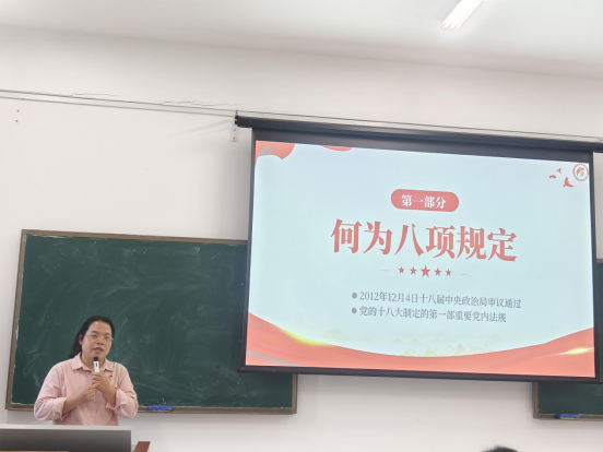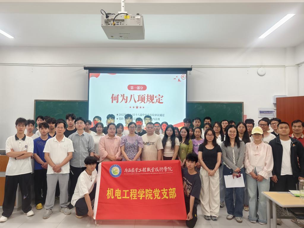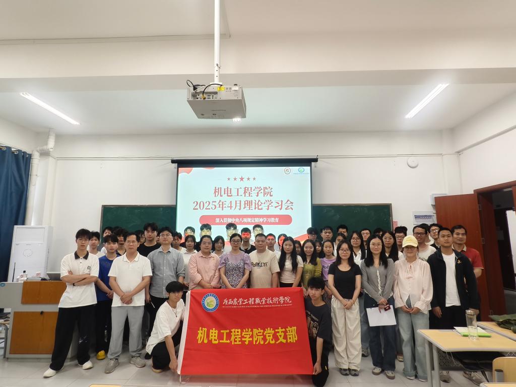 2025 年 4 月 24 日中午12点,机电工程学院党支部于 12 栋教学楼 510 教室成功举办了党课学习活动,由支委委员庞少莲同志授课,党支部全体党员、发展对象及入党积极分子积极参与学习。此次党课旨在深入贯彻中央八项规定精神,加强党员、发展对象及入党积极分子的纪律意识和作风建设,引导大家以实际行动践行党的优良传统。
