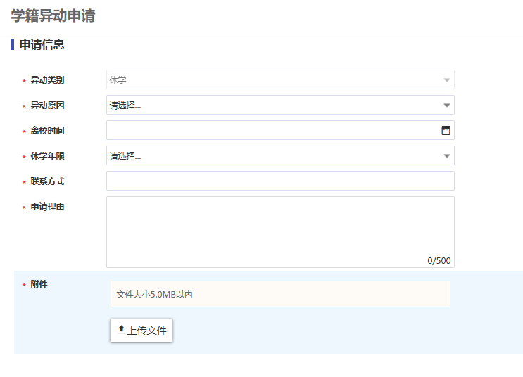 3、根据不同异动类别要求填写相应内容,并按要求上传《关于学籍异动线上办理的通知》中各类别规定的相应附件。