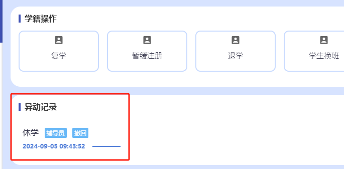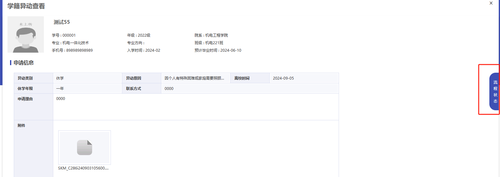 4、提交申请后,可在“异动记录”中查看到目前审批节点,也可点击“异动记录”——点击右方“流程状态”随时查看审批进度,并根据相关进度实时跟进各环节办理情况。第一步审核节点尚未审核前可进行“撤销”操作。如被退回,按退回意见进行修正后重新提交。直至学籍异动全部环节审批完毕,学籍异动方可生效。