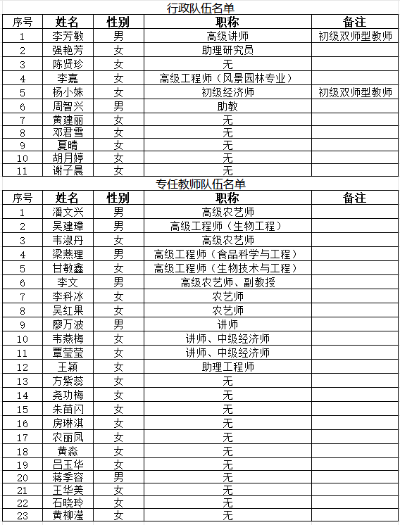农业与生物工程学院拥有一支职称、学历结构合理、理论和实践教学经验丰富、老中青相结合的师资队伍。现有教职工34名,其中行政人员11名,专任教师23名。高级职称8名,中级职称6名,初级职称3名;硕士研究生19人,占比55.88%;双师型教师2名。