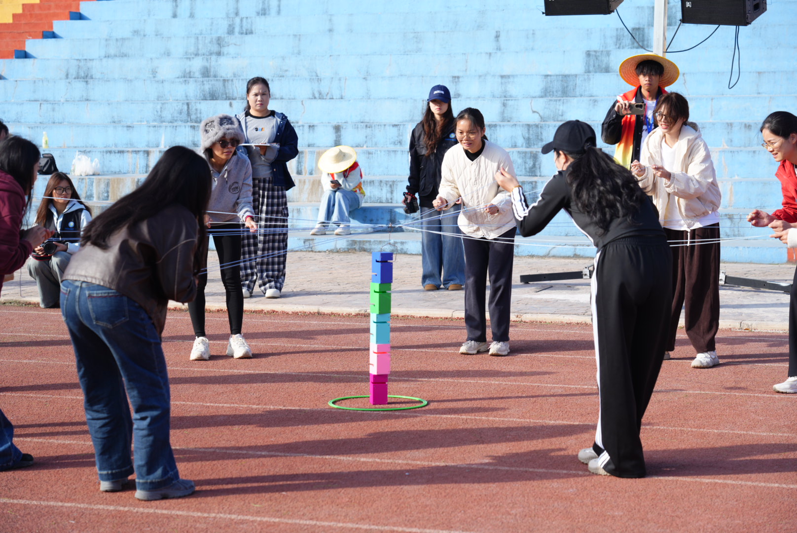 教师趣味赛场热闹非凡、协作氛围浓厚。背篓绣球抛接默契,尽显民族特色与配合智慧;合力搭建分工明确、高效联动,彰显团队凝聚力;“8”字长绳节奏协同、穿梭流畅,欢呼声中凝聚同心力量;旱地龙舟齐喊口号、步伐一致,竞速中尽显协作担当。各项目以协作赋能趣味,充分展现新时代教师凝心聚力、携手奋进的精神风貌。