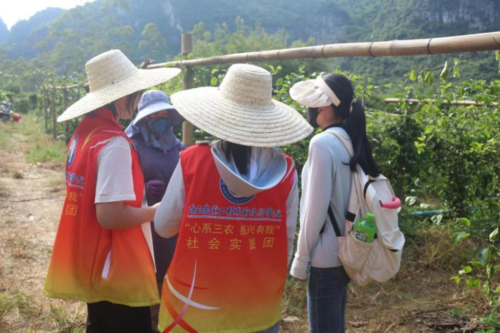 9月1日,实践团在村干部农主任的带领下来到百香果种植基地。百香果的营养价值极高,被称为“水果之王”,百香果园里,连空气都是维C。经百香果种植果农介绍,了解到当地钦蜜9号黄金百香果于2022年在黎亮村推广种植,去年村里的百香果大丰收,卖的价钱也不错,今年继续大面积种植30亩。在现场,“三下乡”学生也了解到百香果种植技术、植物保护技术等专业知识,发挥学科优势,将技术指导搬到田间地头、将产业服务深入地里行间,聚力聚智助力产业振兴。