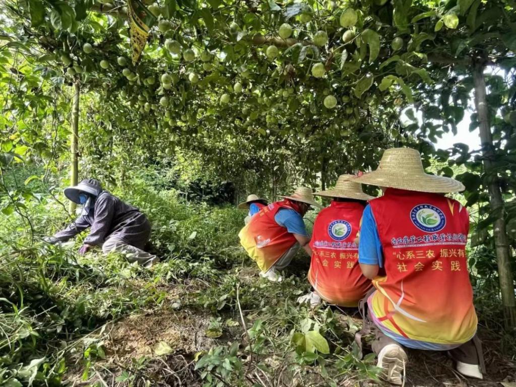图为实践团队员进百香果果园帮农户除草