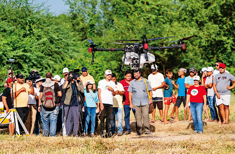 图为2024年2月2日,在巴西阿波迪举行的中巴农业机械化合作示范项目启动仪式上,人们观看一款中国生产的农用无人机。新华社记者 王天聪/摄