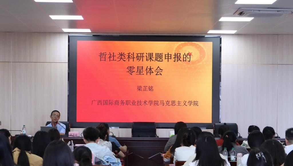 广西国际商务职业技术学院马克思主义学院的梁芷铭院长作哲社类科研课题申报技巧与策略专题讲座。他从科研课题的相关概况、申报建议、撰写要点等方面进行了深入浅出的讲解,为与会老师提供了宝贵的经验和建议。