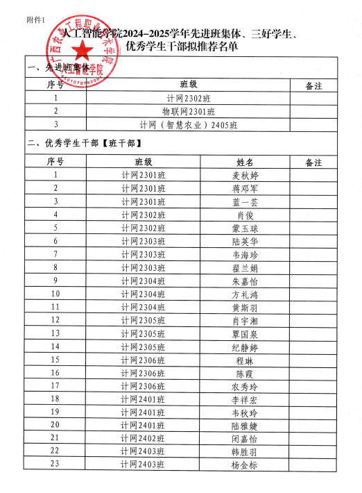 人工智能学院关于2024-2025学年先进班集体三好学生、优秀学生千部拟推荐名单的公示