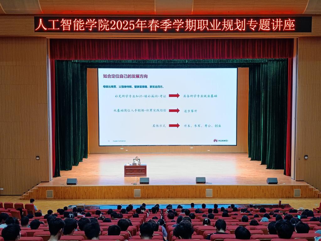 为帮助学生更好的规划大学生活及未来职业发展道路,明确学习目标和方向,提高就业竞争力,2025年4月16日,人工智能学院在学校学术交流中心成功举办大学生职业生涯规划专题讲座。本次讲座特邀华为技术有限公司广西政企商业市场副总经理杜云花女士担任主讲嘉宾,人工智能学院副院长江咏海、全体教师及大一、大二全体学生参加活动。