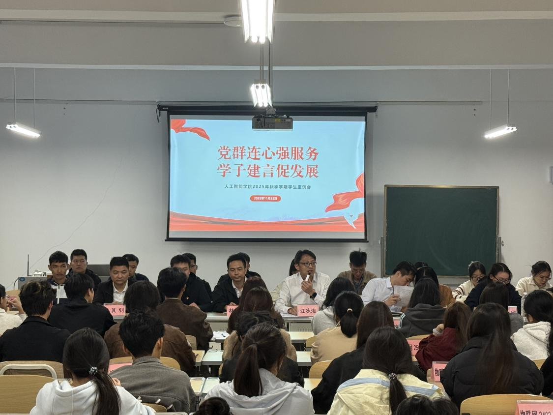 为深入践行教育家精神,强化AI教育高质量发展动能,畅通学生参与学院治理渠道,践行“以生为本”办学理念,2025年11月25日,人工智能学院同步开展“聚焦学生需求,共促AI学院发展”秋季学期学生座谈会与“党群连心强服务,学子建言促发展”主题党日活动。人工智能学院党支部书记、副院长江咏海,各专业负责人,24级、25级全体辅导员、班主任,以及24级、25级各班班长、学习委员及学生代表共同参会,凝聚师生合力共绘学院发展蓝图。