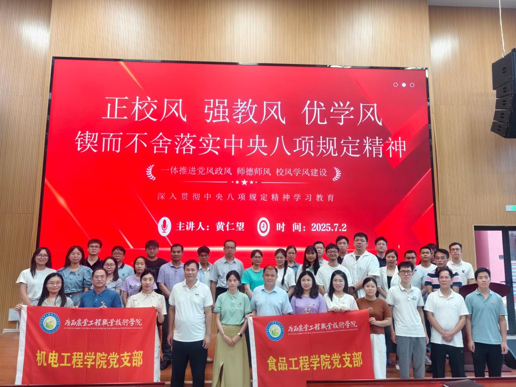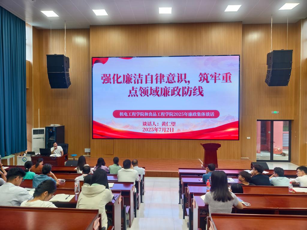 2025 年 7 月 2 日,食品工程学院党支部联合机电工程学院党支部于 8 号阶梯教室开展“深入贯彻中央八项规定精神学习教育专题党课暨集体廉政谈话”活动。学校党委副书记、纪委书记黄仁望同志及两个党支部全体教师参与本次会议。