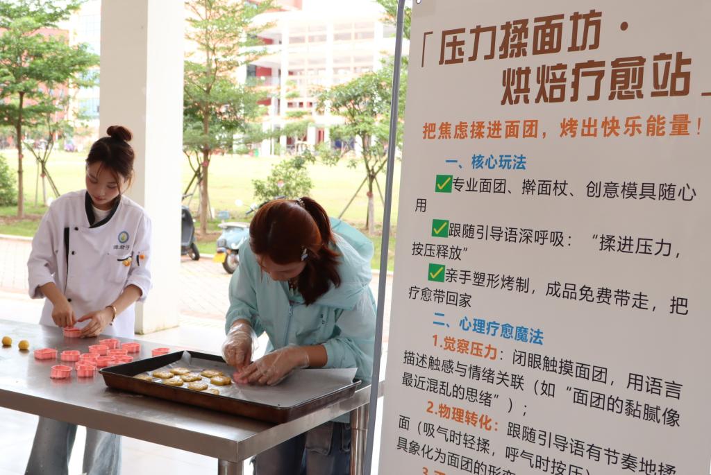 活动现场设置三大特色区域,吸引众多师生踊跃参与。在“压力揉面坊·烘焙疗愈站”,参与者在揉面、擀面过程中,跟随引导语将压力转化为触觉体验,通过重复性动作与烘焙香气实现情绪释放。有同学分享道:“揉面的节奏让我内心渐趋平静,烤制完成的饼干仿佛承载着压力一同消散。”