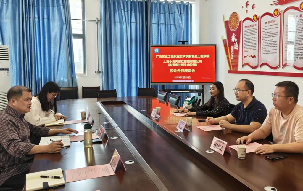 2025年3月27日上午,陈香贵集团公司代表、深圳市食点彩食品餐饮有限公司负责人一行三人来访我院,学院副院长黄玉叶、教学秘书吴凤莲、就业创业指导干事陈珺阳参加座谈。