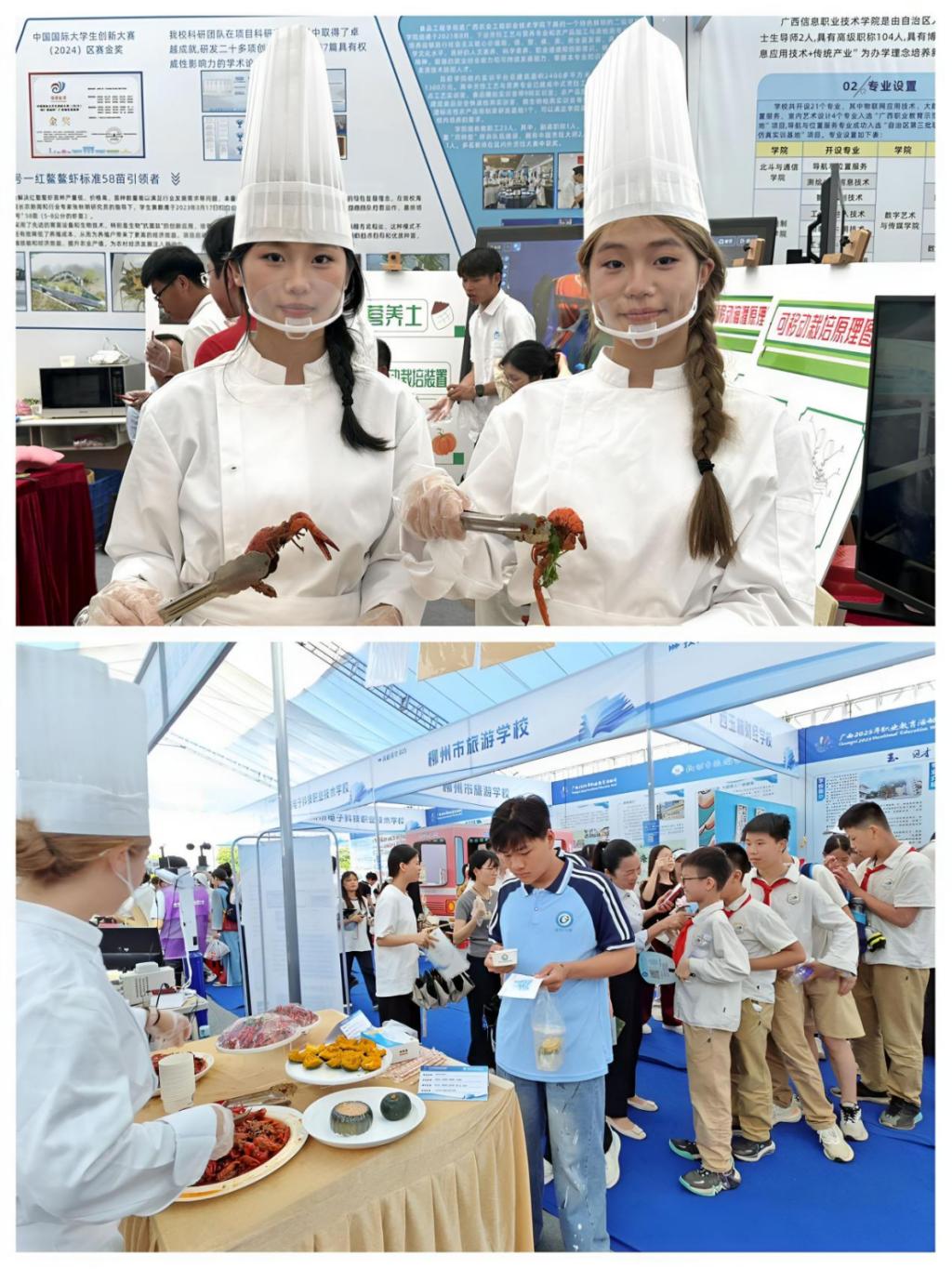 我院学生代表凭借扎实的专业功底,烹制麻辣、蒜蓉风味红螯螯虾美食,参观者纷纷驻足品尝,对菜品的口感与创意赞不绝口。